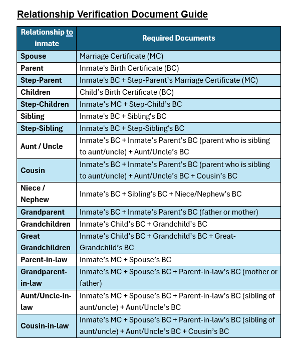 If you are related to the inmate, attach Documentary proof (e.g., Marriage Certificate, Birth Certificate) of your relationship with the inmate in the application form. Otherwise, your relationship with the inmate will be considered as a friend.